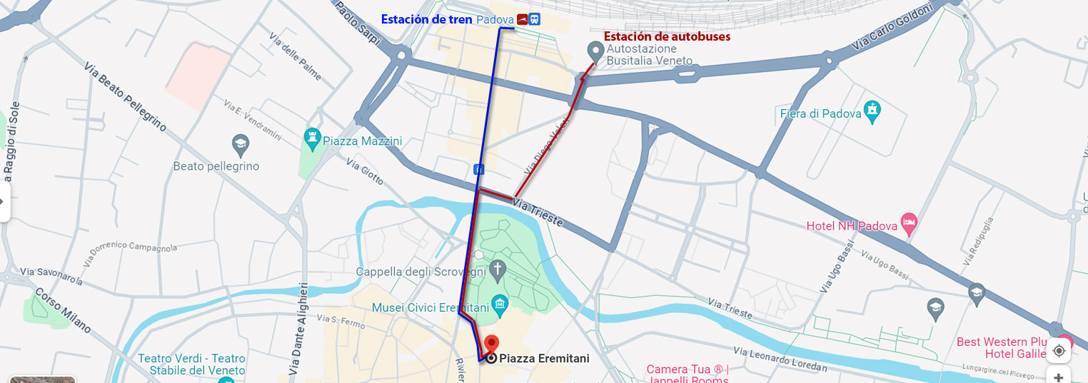 Llegar a la Piazza Eremitani de Padua desde la estación de tren o autobús es muy fácil. La ruta a pie no le llevará más de 10 minutos desde cualquiera de los dos lugares. Alternativamente, frente a la estación central de trenes de Padua, hay varios autobuses que paran frente a las Poste Italiane: cruce la calle, detrás del edificio de la Cassa di Risparmio, y encontrará la plaza del punto de partida